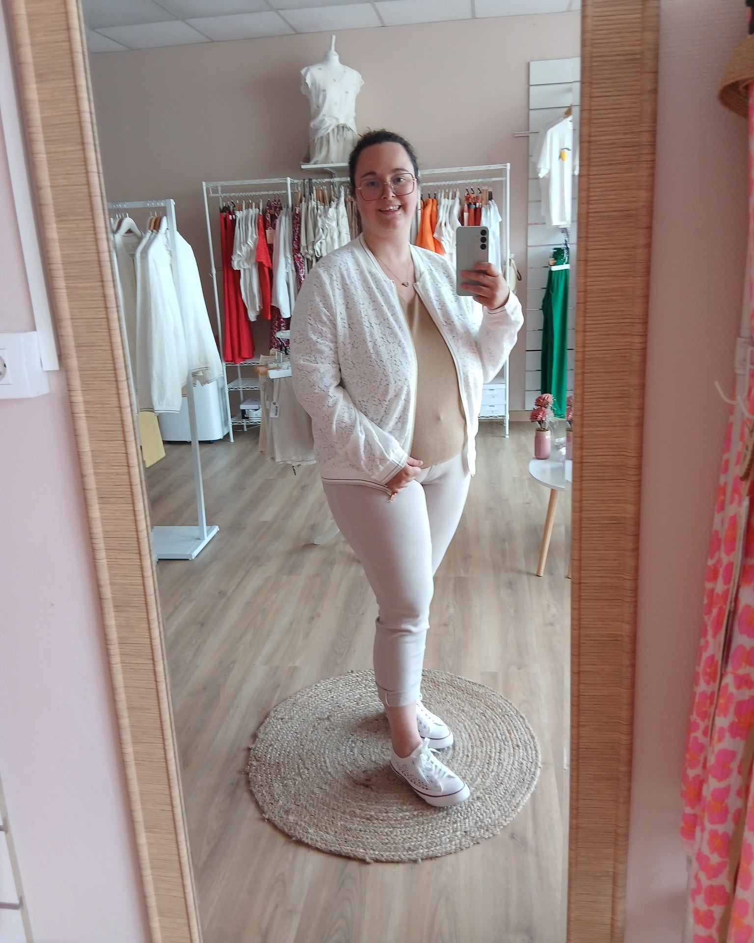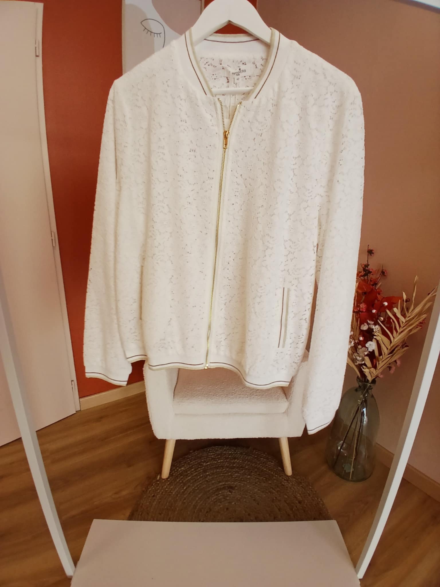 BOMBERS ANNA, blanche et en dentelle. Elle a un col et une fermeture éclair dorés, style décontracté, fabriquée avec des motifs de dentelle.