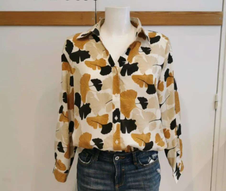 Chemise MARIA à manches longues ornée d'un motif de feuilles de ginkgo, de style décontracté, un col classique, et des boutons.