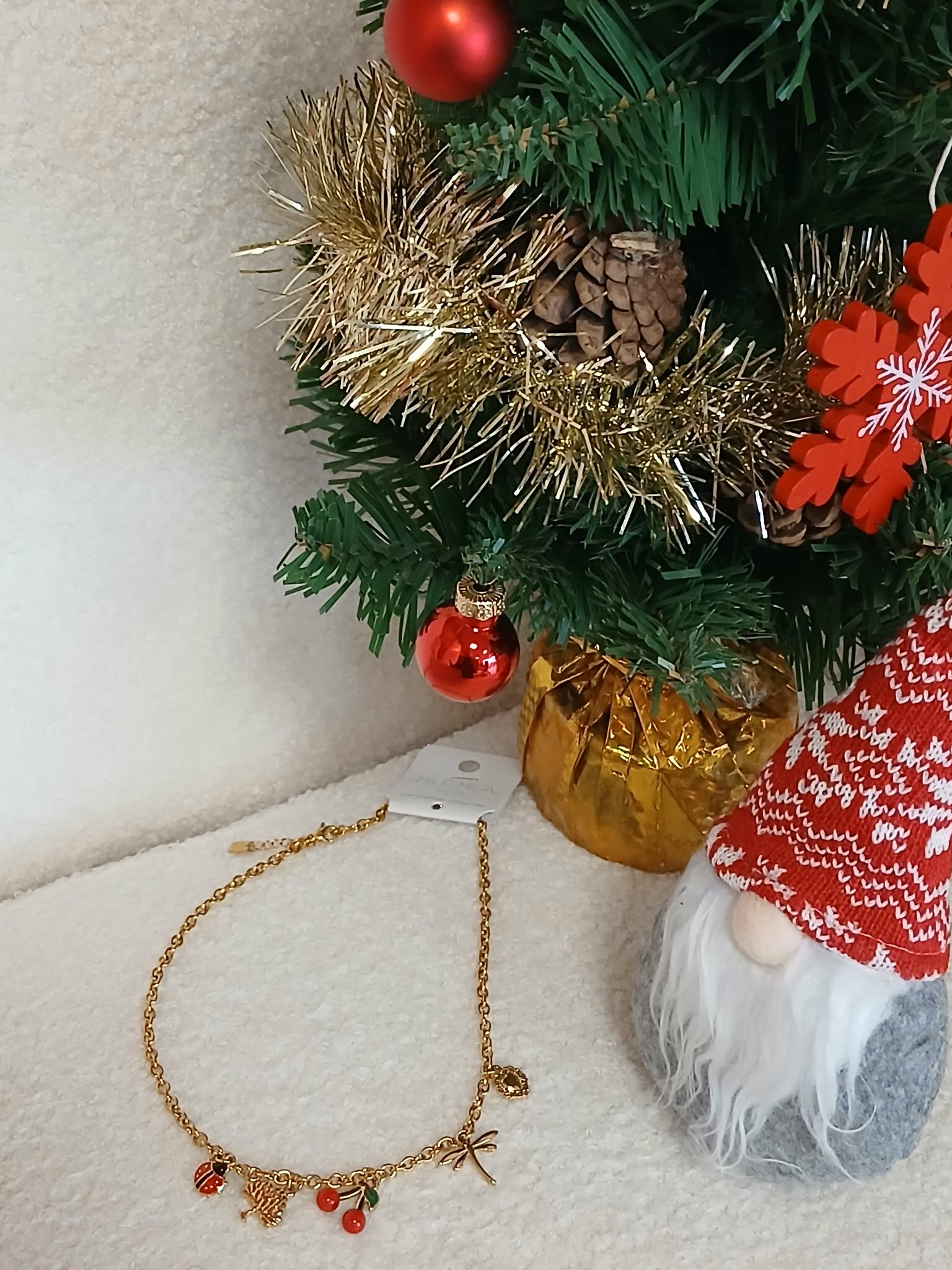 Ce collier avec breloques en acier inoxydable doré apporte une touche de fantaisie et d'originalité à toutes vos tenues. Avec ses charmants pendentifs (cerise, libellule, coccinelle...), ce bijou raconte votre histoire et affirme votre personnalité avec délicatesse.