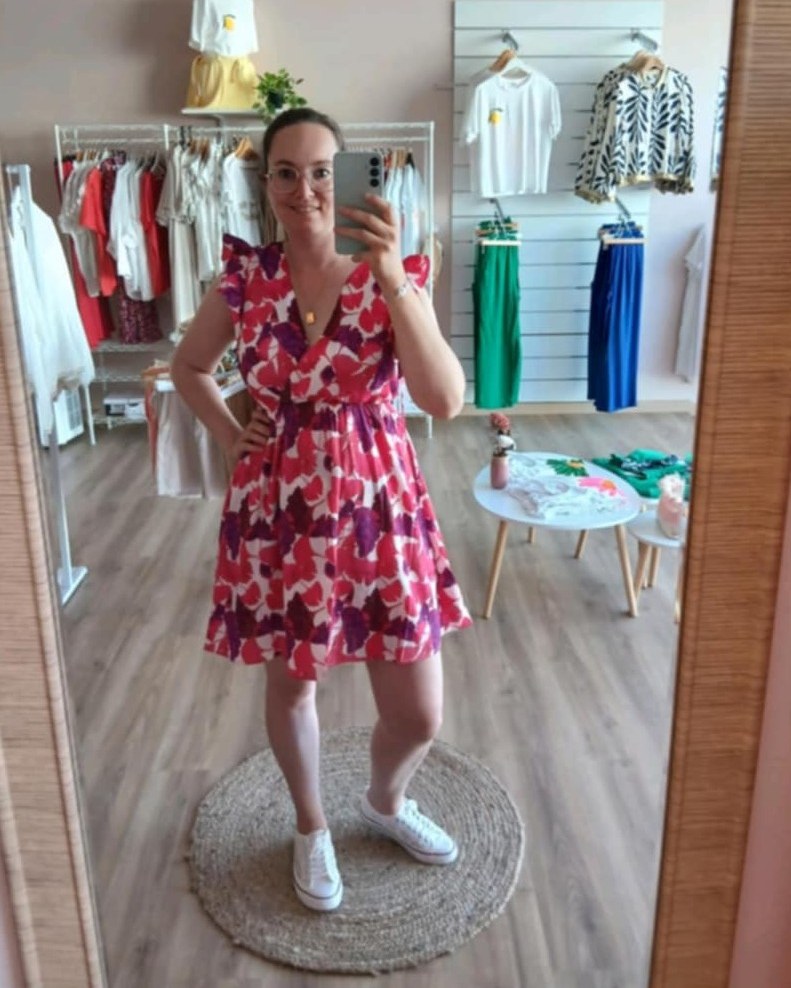 Combi-short AMBRE, motif feuille de gecko rouges et roses à manches courtes avec un col en V.