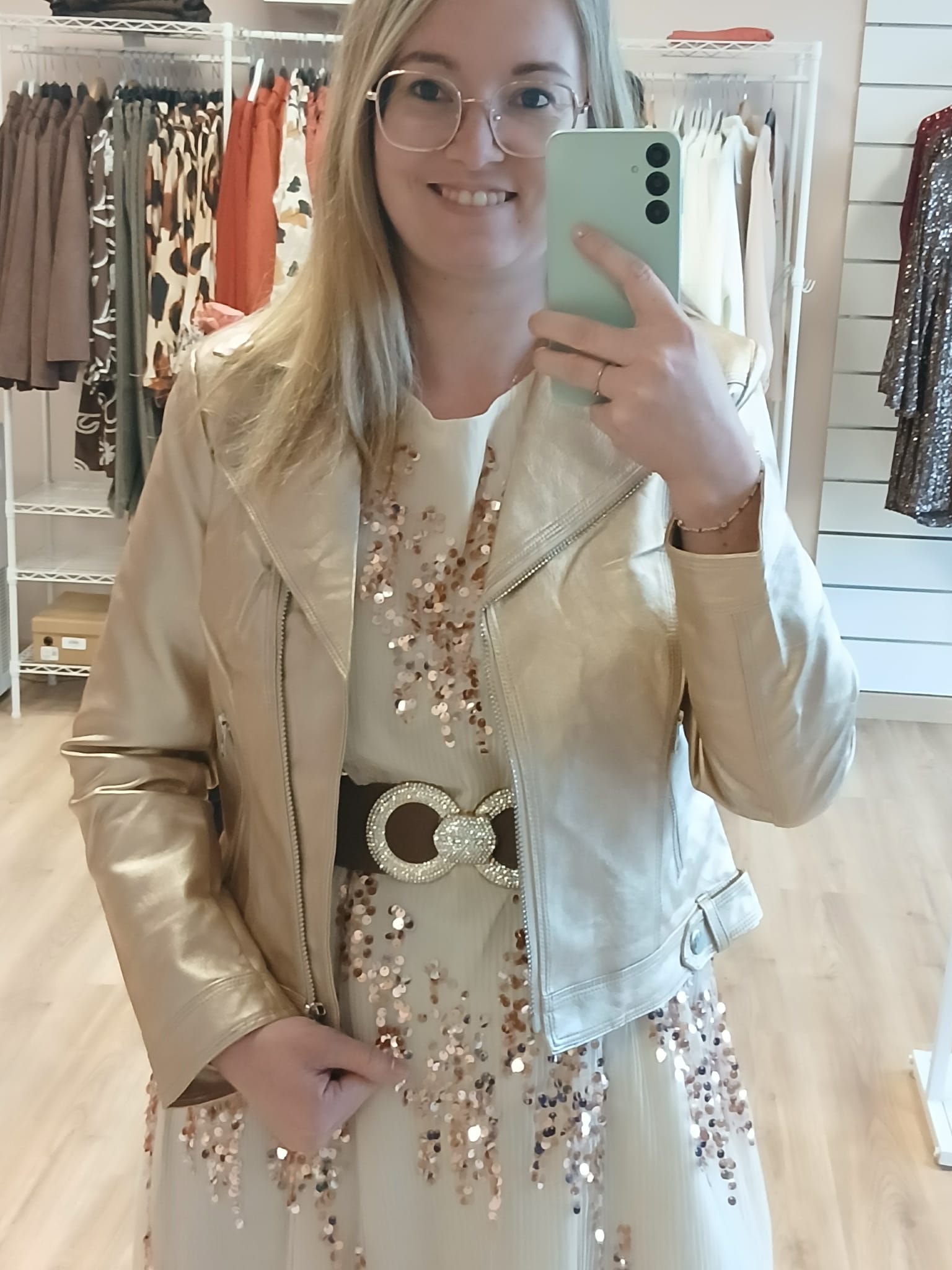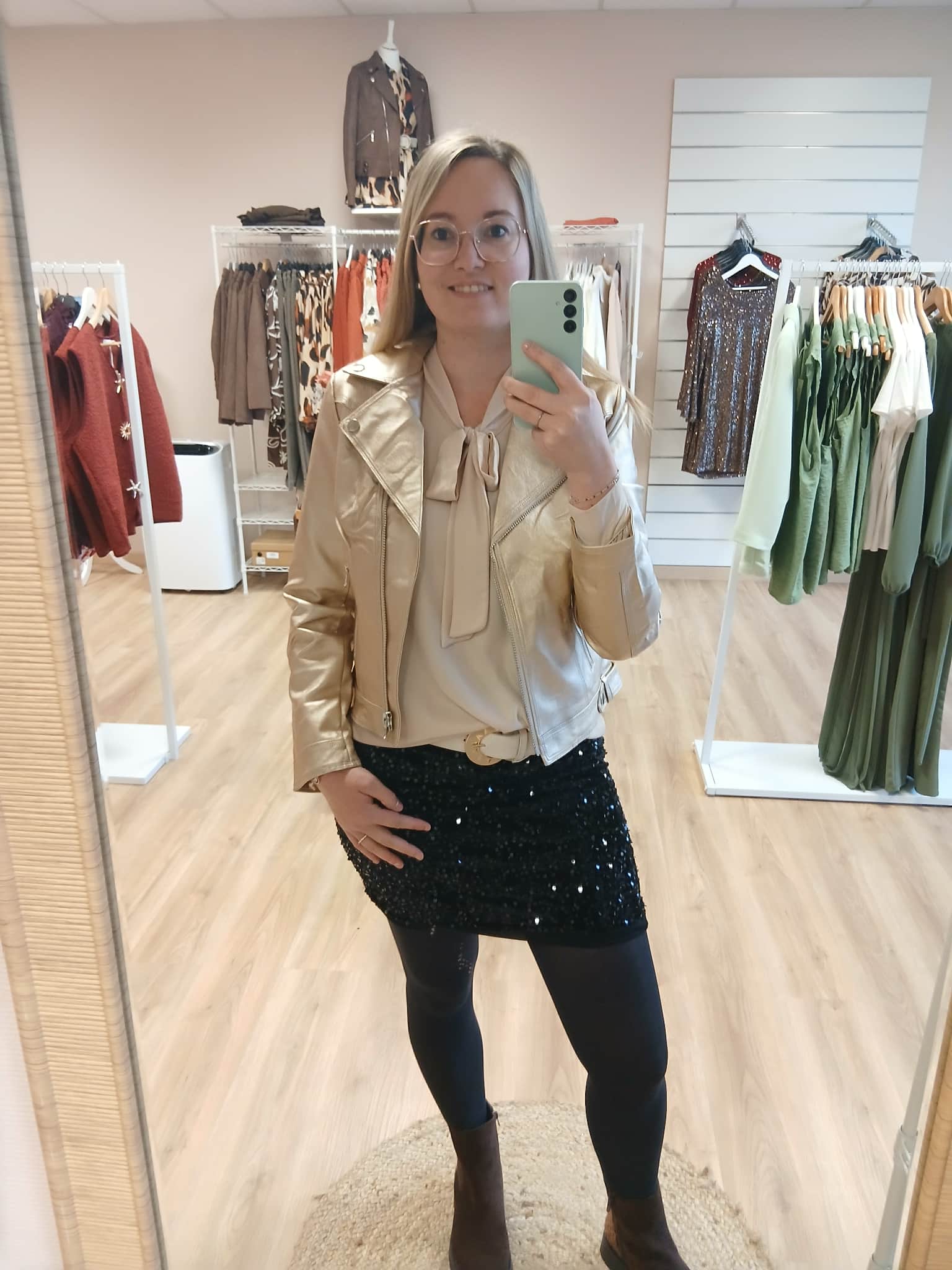 Adoptez le style rock élégant avec ce perfecto en simili cuir de qualité qui allie caractère et sophistication. Le Perfecto Charly se décline en deux couleurs audacieuses : doré lumineux ou noir intemporel. Avec sa coupe cintrée flatteuse et ses détails raffinés, il est la pièce statement qui transforme instantanément vos tenues en looks affirmés et modernes.