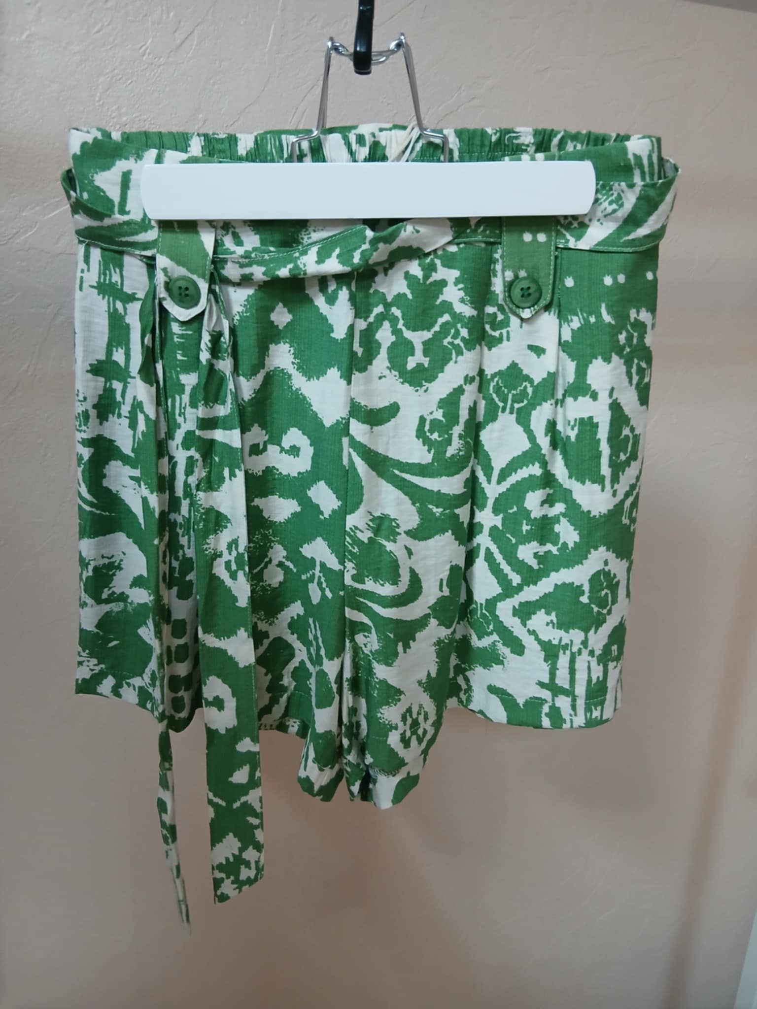 Le short ARTHUR est vert et blanc avec un motif abstrait. Il a une ceinture à nouer et des boutons.